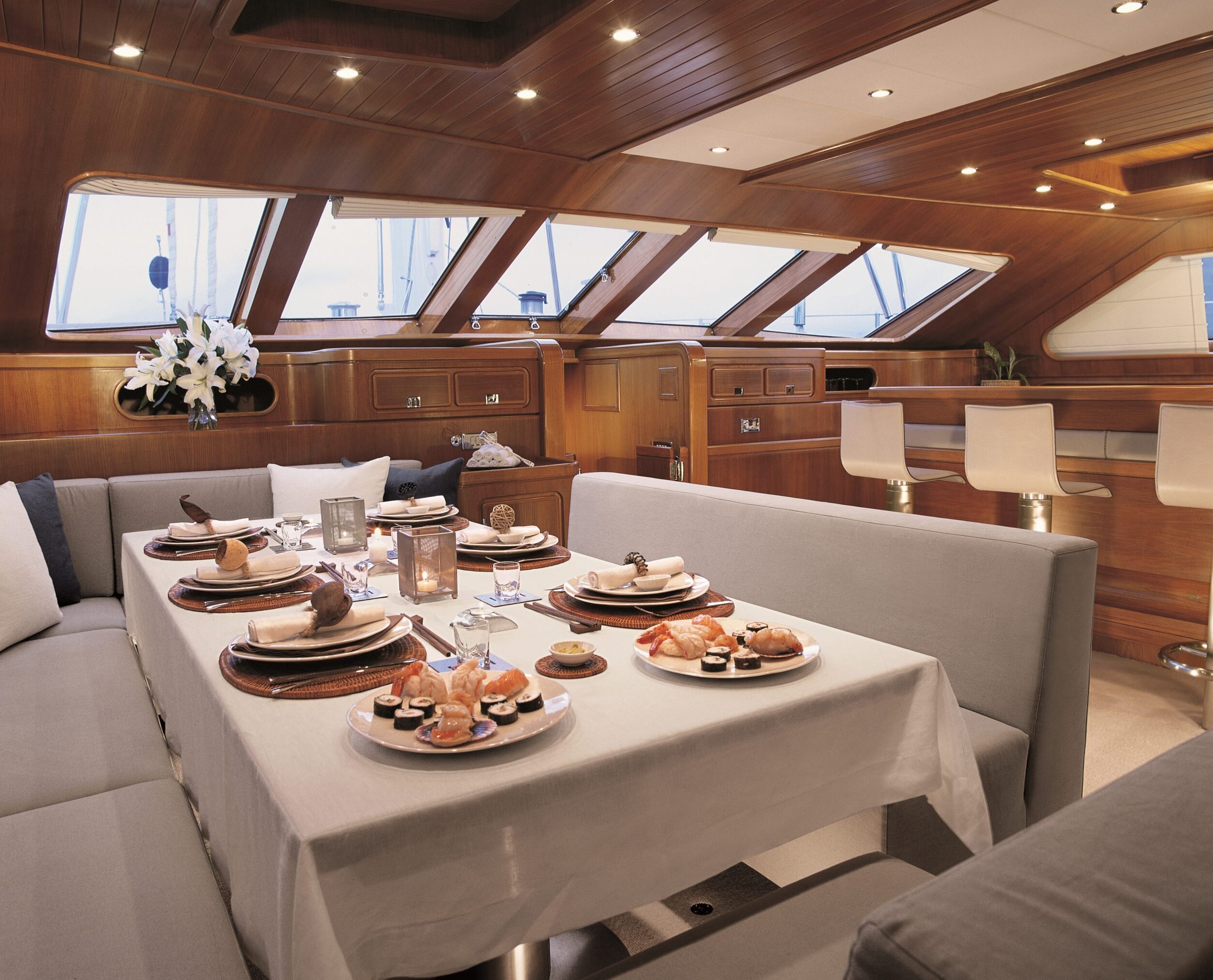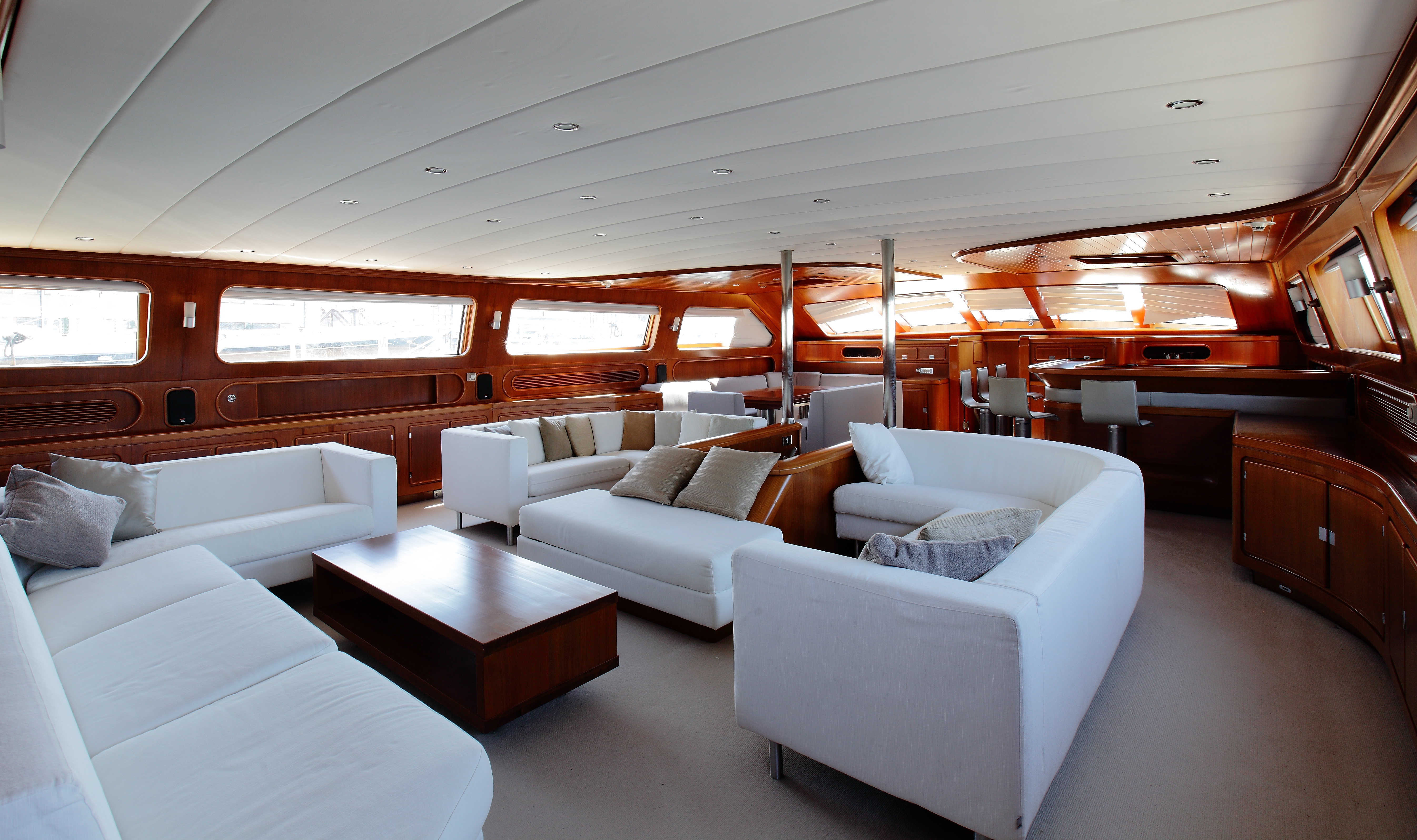 The interiors of Enterprise C reveal a yacht designed to be inhabited over time. The main saloon, generous in volume and continuity, is organised as a true living space rather than a formal reception area. Curved seating, unobstructed sightlines, and a warm use of wood create an atmosphere suited to long days at anchor as much as extended passages.