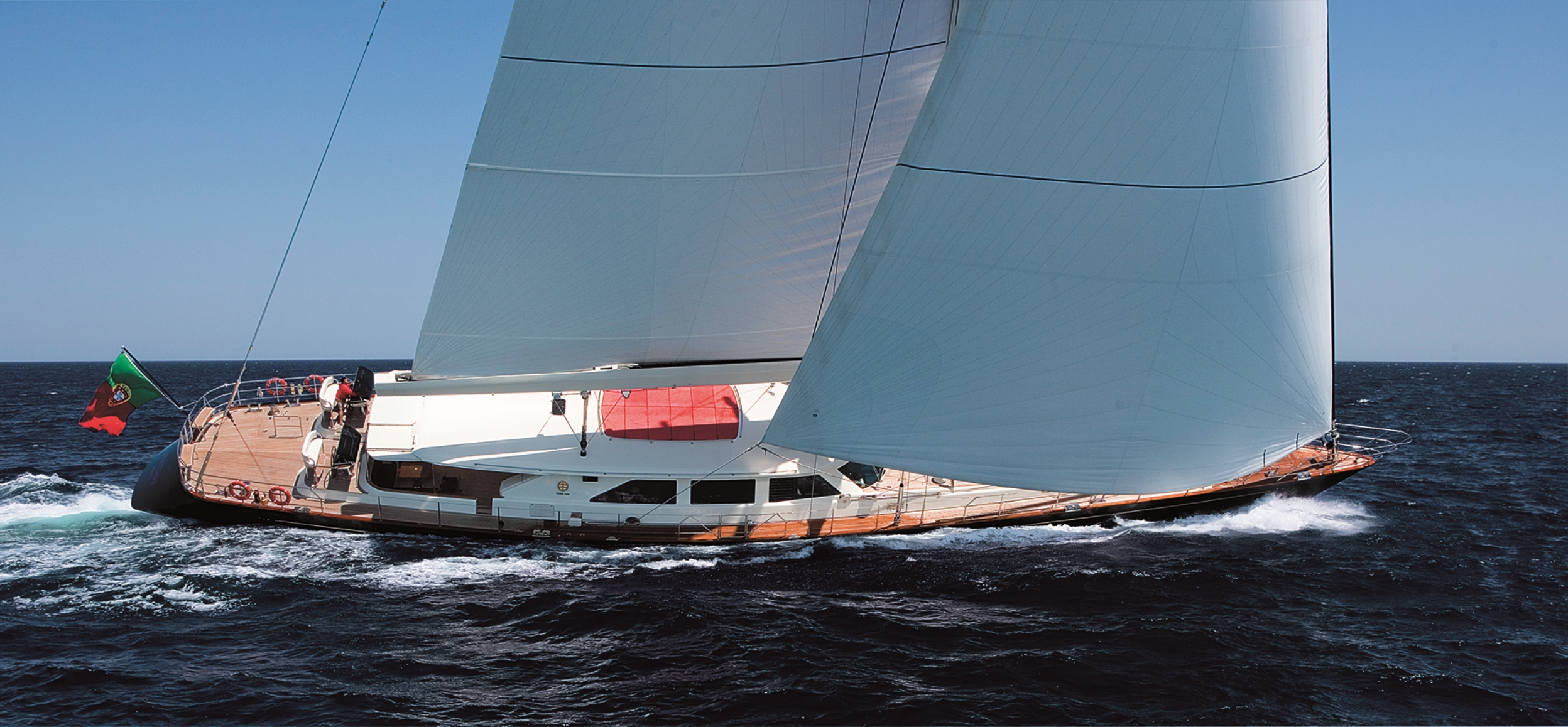 Naval architecture by Ron Holland Design lends her the assured proportions for which the yard became renowned in the late twentieth and early twenty-first centuries: a powerful beam of 9.73 metres, a deep draught of 8.65 metres, and the balanced geometry of a ketch conceived for blue-water passages.