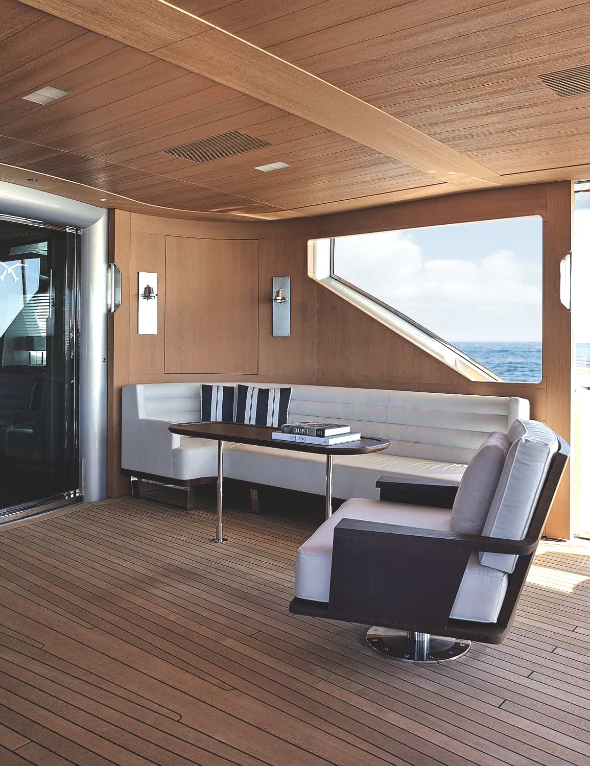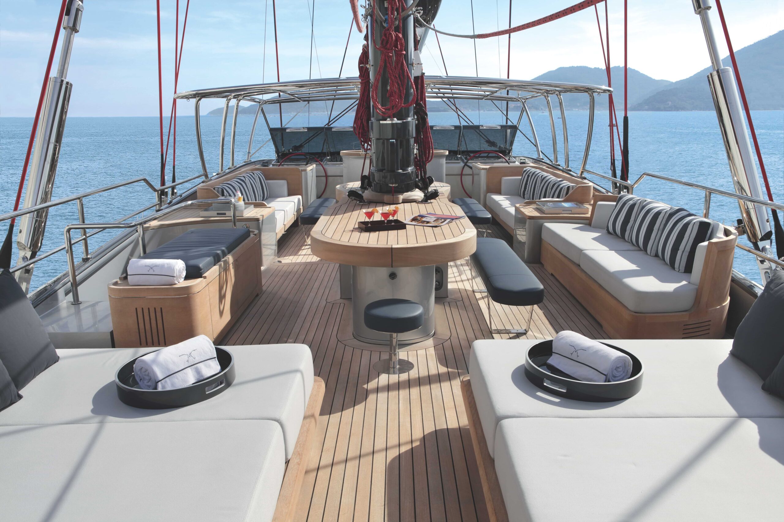 Her interiors, drawn by Perini Navi, are designed as a luminous residence afloat. A full-beam owner’s suite and five guest cabins provide accommodation for up to twelve guests, arranged with refined discretion and enveloped in natural light. The main saloon, spread across more than 100 square metres, favours fluid circulation and panoramic views through wide windows. Teak decks extend into convivial spaces: an expansive aft cockpit and generous foredeck invite al fresco living, while the geometry of the ketch rig ensures balanced sail handling and effortless command. Every element of Piropo reflects the Perini Navi philosophy of merging lifestyle with performance.