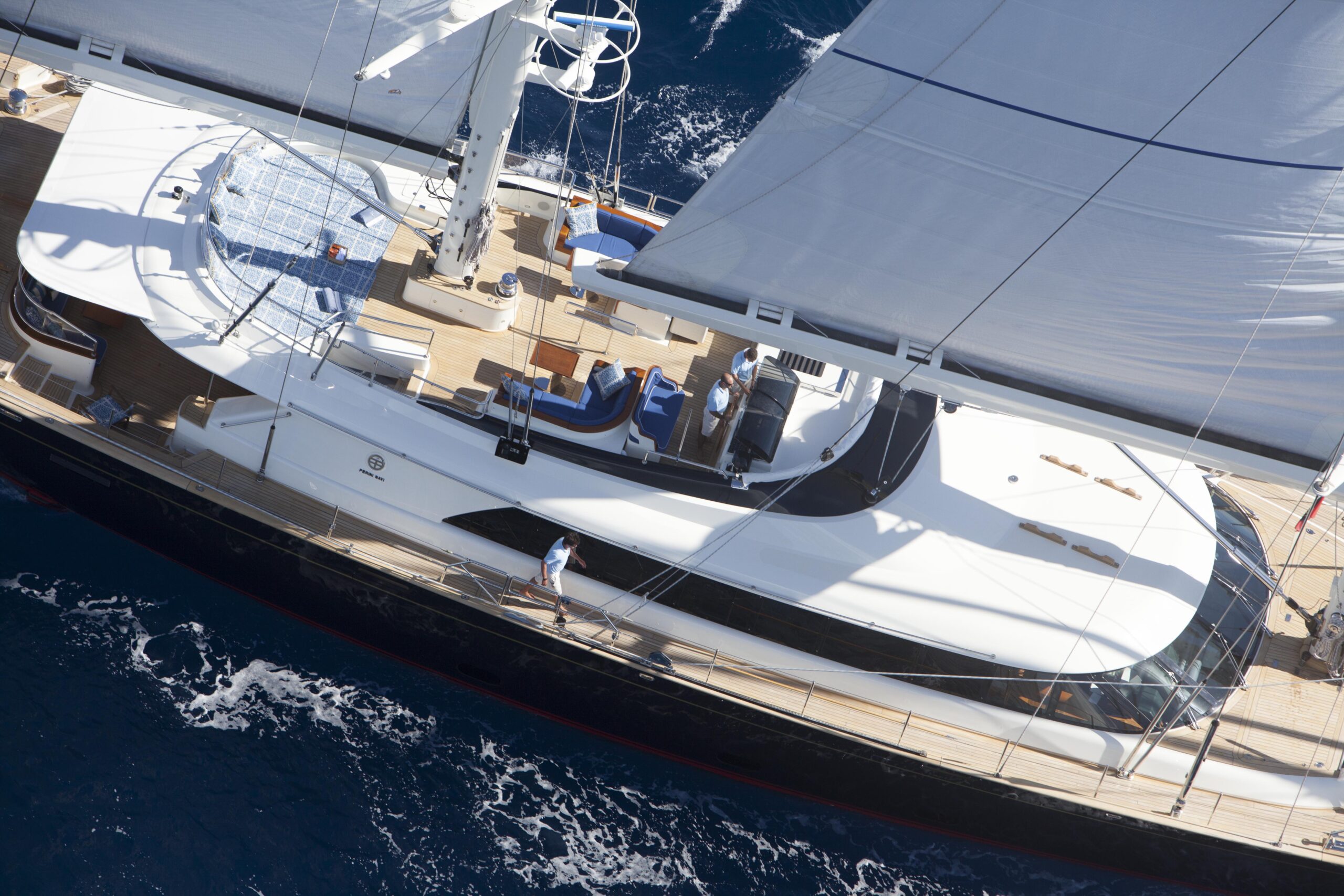 Conceived as the smaller counterpart to the emerging 56-metre Perini Navi generation, Victoria A translates the profile and architectural language of the larger series into a 43-metre sailing yacht, preserving its visual equilibrium while adopting a more dynamic sail plan. The result is a yacht that shares the presence of the 56m yet expresses a more pronounced sailing temperament.