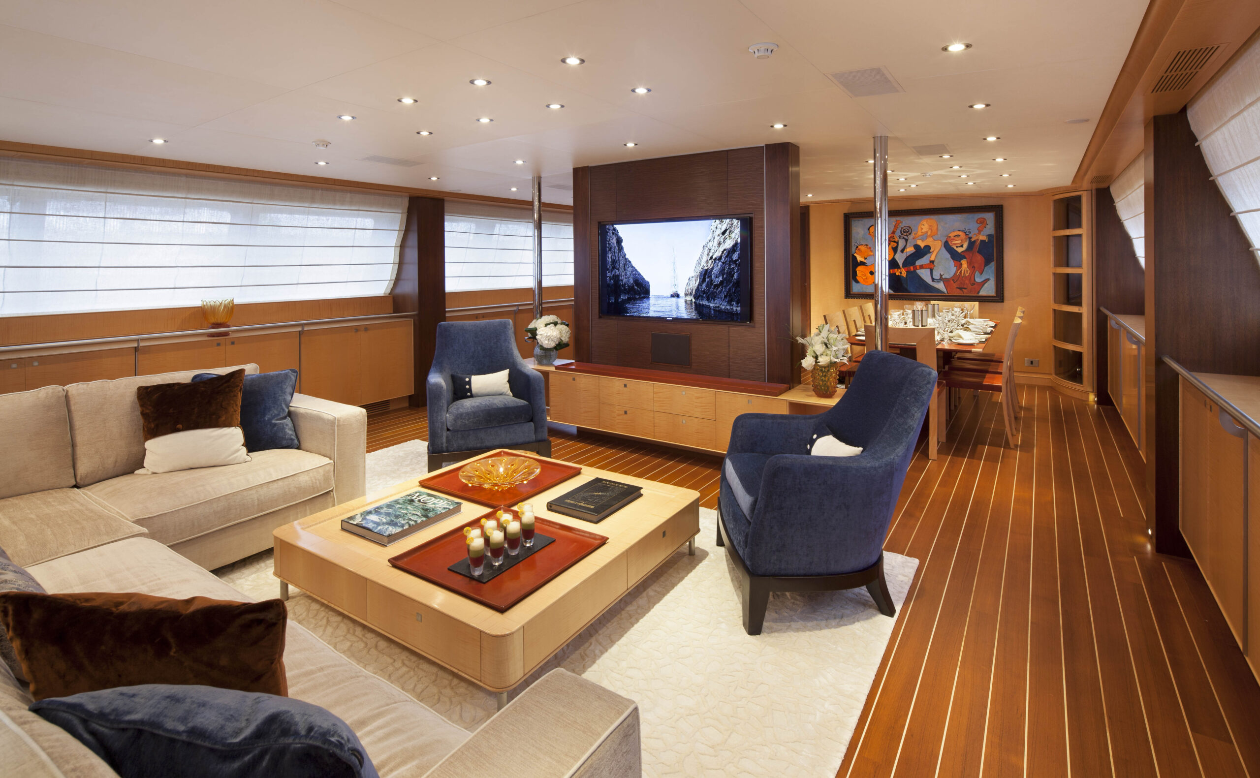 The exterior lines mirror the compositional clarity of the 56-metre platform, maintaining Perini Navi’s characteristic balance between superstructure volume and hull continuity. Interiors follow a minimalist approach, reducing ornament in favour of spatial calm and long-stay liveability, with Cristiano Gatto organising the spaces around clarity of movement rather than decorative hierarchy.